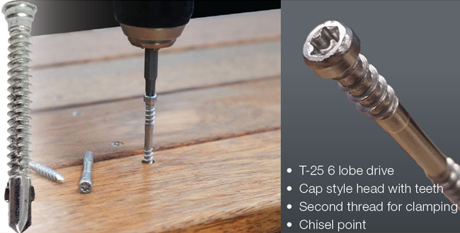 - Top thread helps pull the deck boards to the joist providing a more secure clamping effect.